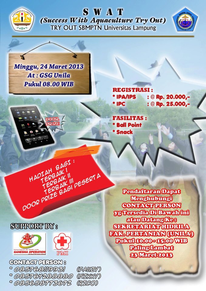 Himpunan Mahasiswa Jurusan Budidaya Perairan Bekerja sama dengan Ganesha Operation dan Palang Merah Indonesia mengadakan Try Out Seleksi Bersama Masuk Perguruan Tinggi (SBMPTN) yang akan diadakan pada tanggal 24 Maret 2013. Kegiatan try out merupakan kegiatan simulasi yang bertujuan untuk mengukur kemampuan siswa dalam menghadapi ujian. Ujian tersebut bisa berupa ujian kelulusan sekolah menengah atas (SMA) yang biasa kita sebut dengan ujian nasional (UN) atau ujian masuk perguruan tinggi negeri yang saat ini kita sebut Seleksi Bersama Masuk Perguruan Tinggi Negeri (SBMPTN).